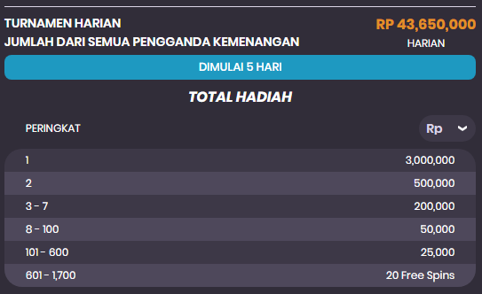 1,700 hadiah harian senilai Rp 43,650,000. Akan ada 28 turnamen selama
